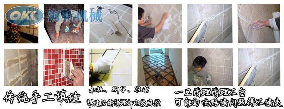 而 在這些縫隙中填入粘結(jié)劑成為填縫,傳統(tǒng)填縫方式則是采用人工用木條、鐵板甚至用手,小量的將粘結(jié)劑慢慢填補(bǔ)縫隙,或者大面積抹涂后再針對(duì)縫隙大小,用鐵線 對(duì)準(zhǔn)縫隙慢慢壓平粘結(jié)劑,等待物料干結(jié)后再清洗磚面,遇到光滑面磚可以清洗干凈,如磚面是亞光或者不平整文化磚,則無(wú)法清洗,造成施工賠償?shù)燃m紛。